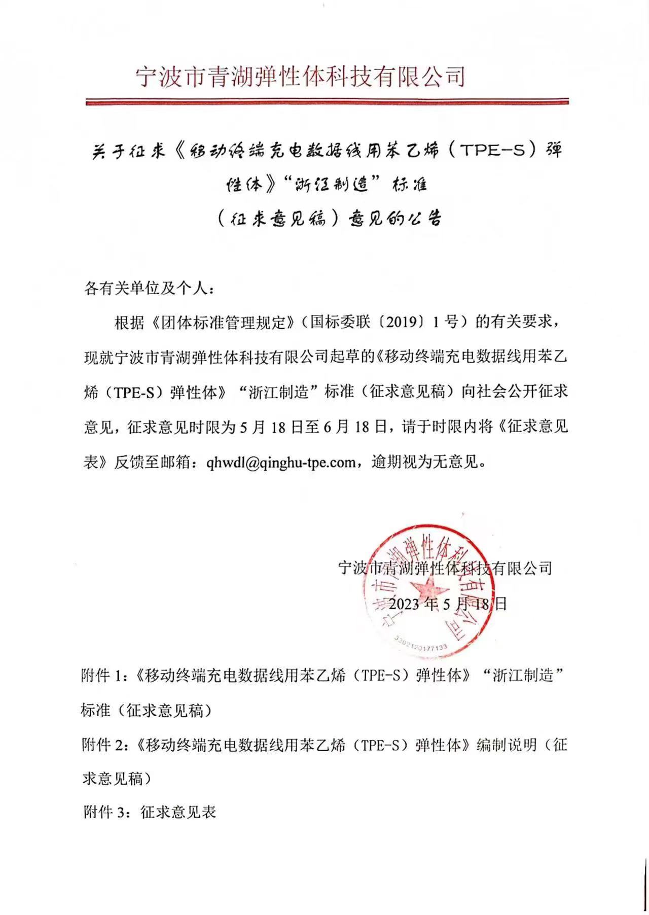 關(guān)于征求《移動(dòng)終端充電數(shù)據(jù)線用苯乙烯(TPE-S)彈性體》“浙江制造”標(biāo)準(zhǔn)(征求意見稿)意見的公告如下: